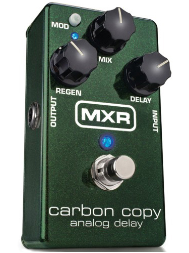 The MXR Carbon Copy Analog Delay features a completely analog audio path for the ultimate in rich, warm delay made possible only by old-school bucket brigade technology. This design boasts an amazing 600ms of delay time with optional modulation via a top-mounted switch and a simple, three-knob layout that controls Delay time, Mix (dry/wet blend), and Regen (delay repeats) all in a pedal no bigger than a Phase 90. In addition, two internal trim pots offer user-adjustable width and rate control of the modulation for even more tonal options. The Carbon Copy will take you from crisp bathroom slap echoes to epic, Gilmour-esque delays with a twist of a knob. True hardwire bypass, single 9-volt operation, and stage-ready blue LEDs round out the package. Available only from Dunlop Manufacturing, the world's leader in analog pedal technology.