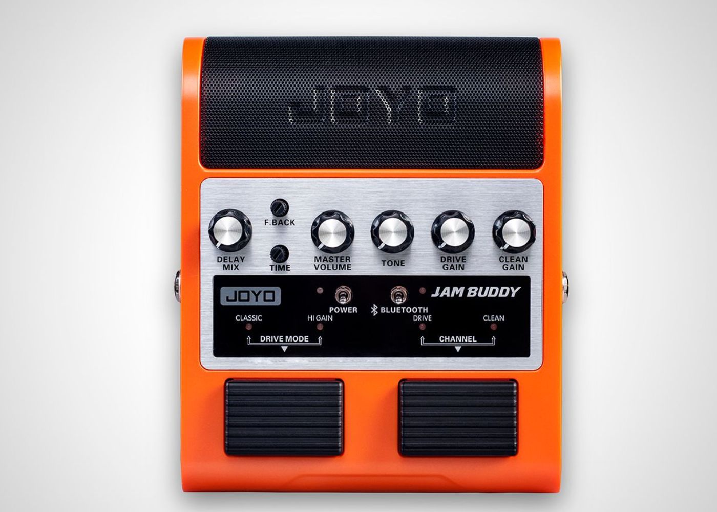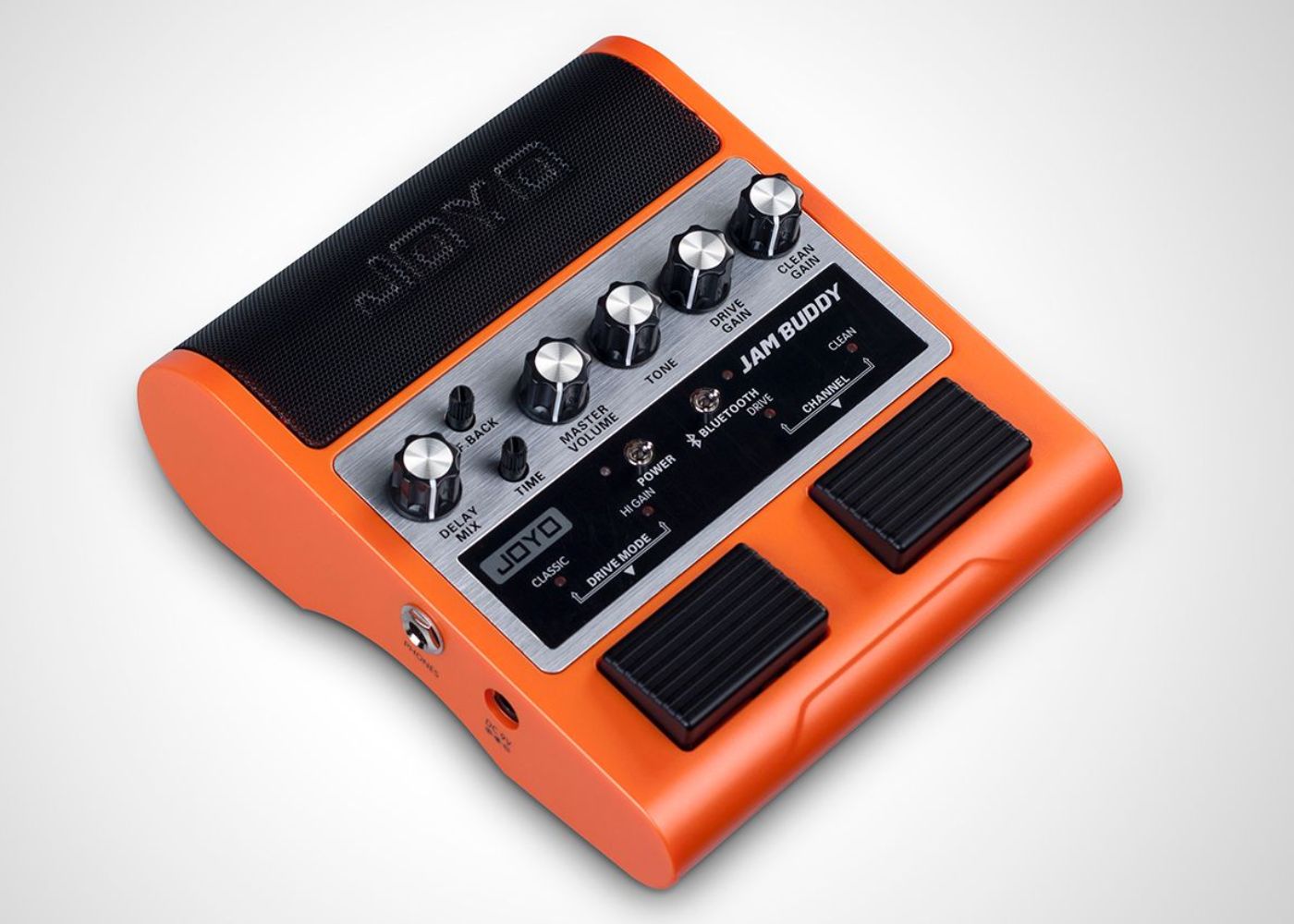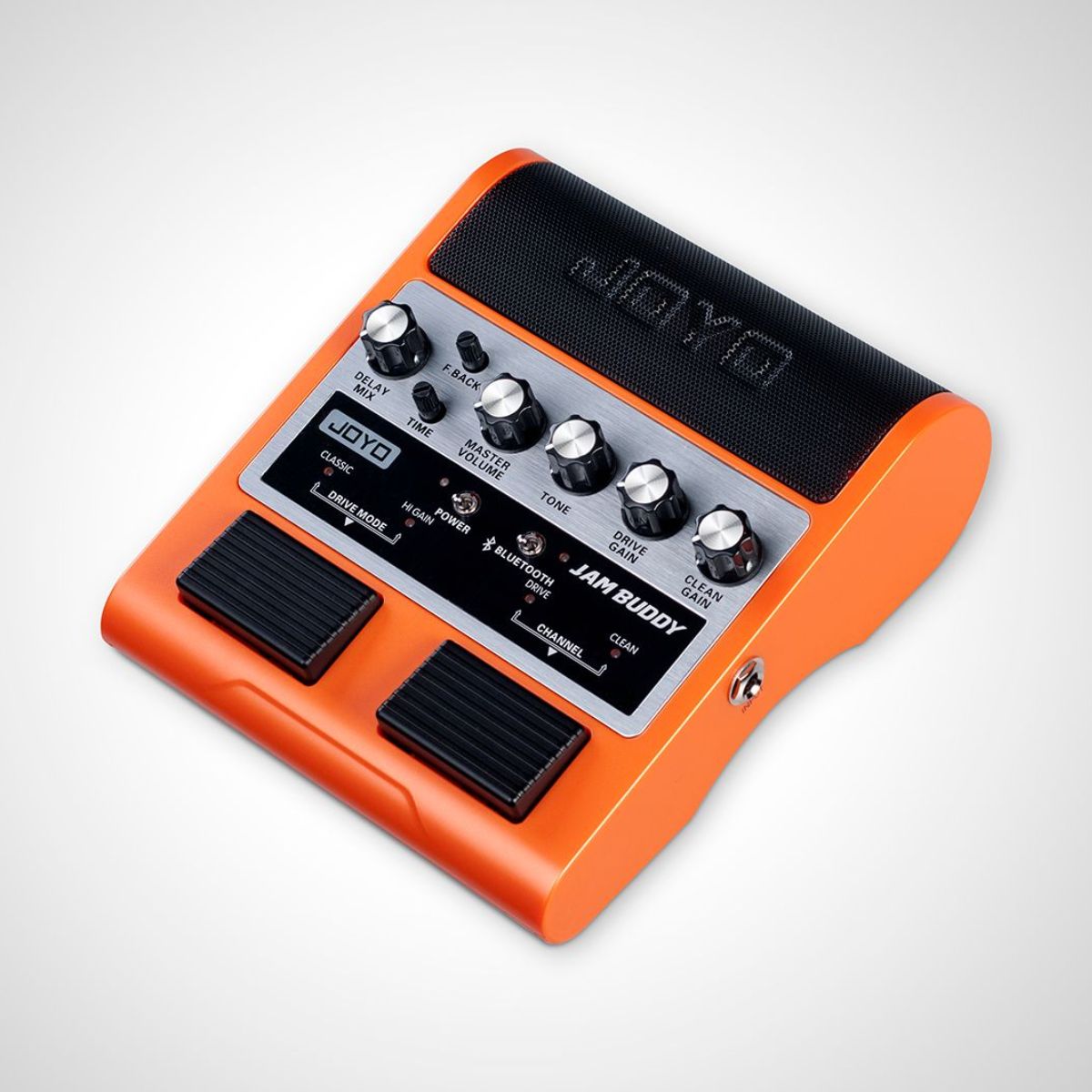 It took JOYO’s engineers two years to develop this patented new product: The JAMBUDDY Combining guitar playback with its reduced high frequency range due to the sound of 12-inch speakers and also full range normal music playback is a difficult task. Some products on the market have already dealt with this issue and they are nice practice boxes that are controlled by hand on a tabletop. But this is not how guitar players operate their gear, we need our hands free, and we control our gear with our feet. JAMBUDDY combines both aspects, it is a floor based dual channel amp simulator that can be switched with your feet. It also accepts a BLUETOOTH signal to play back your favourite backing tracks and songs you want to jam along to.
