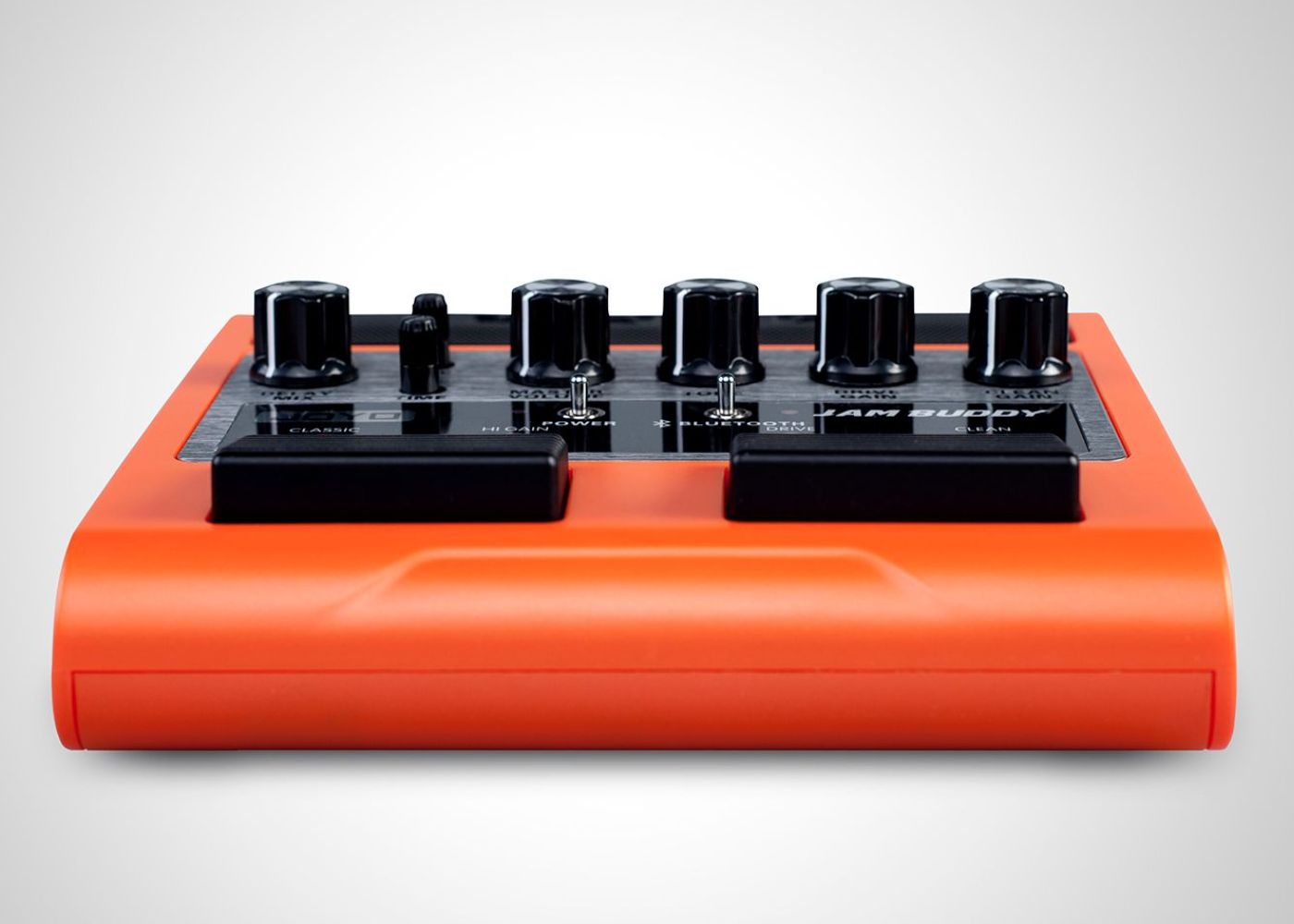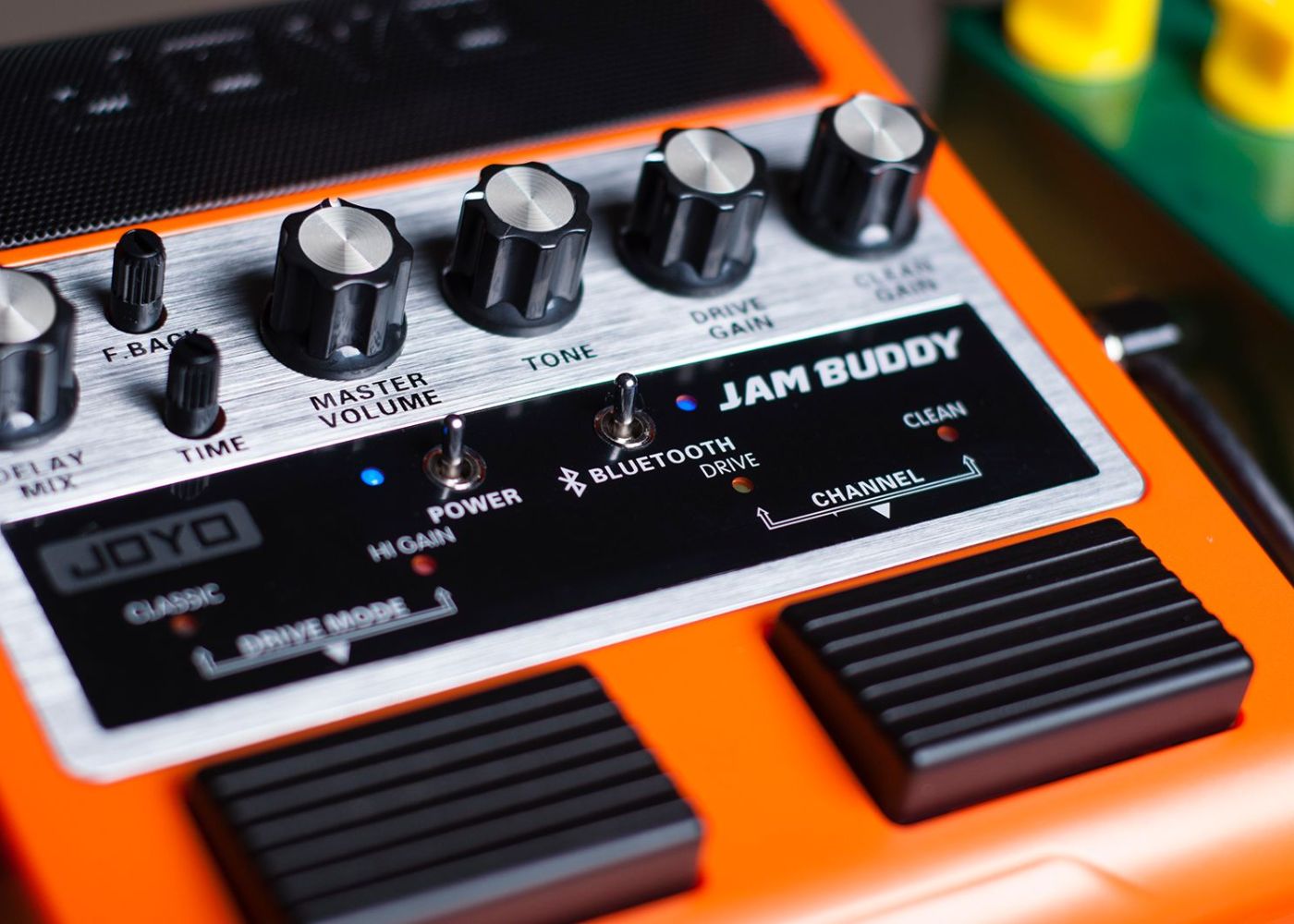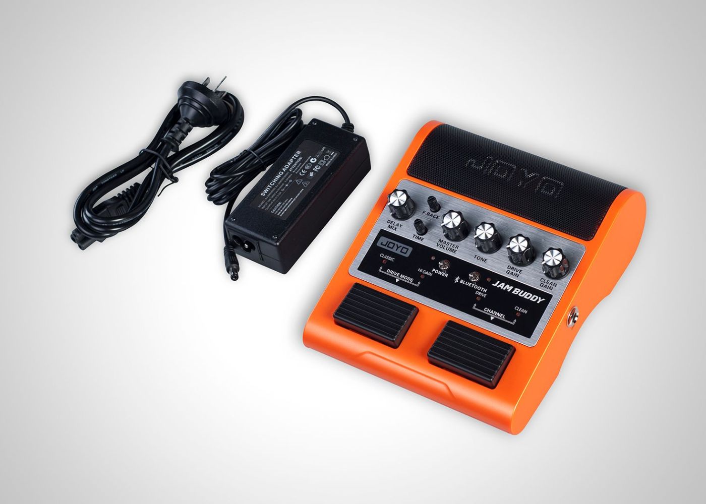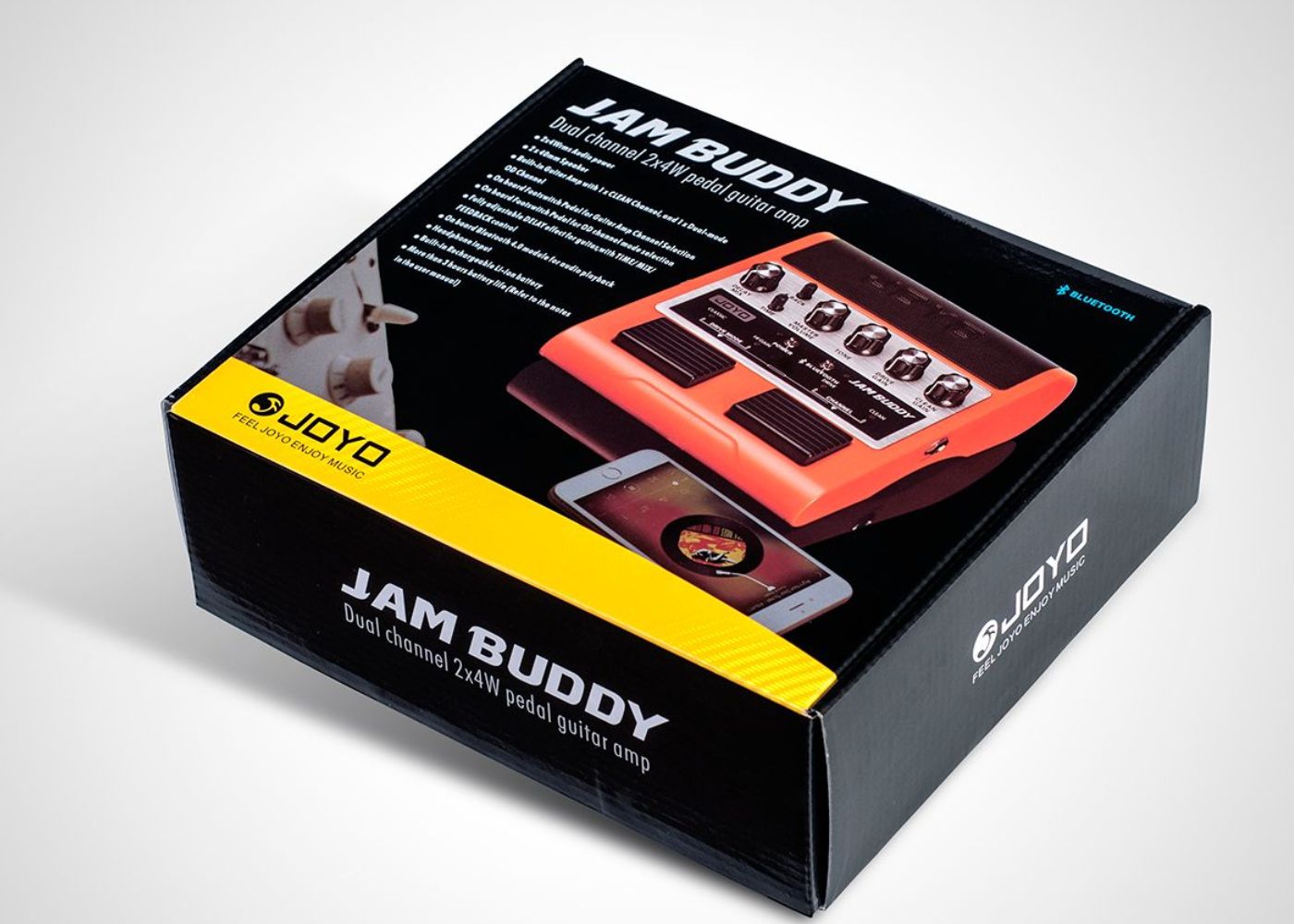 It took JOYO’s engineers two years to develop this patented new product: The JAMBUDDY Combining guitar playback with its reduced high frequency range due to the sound of 12-inch speakers and also full range normal music playback is a difficult task. Some products on the market have already dealt with this issue and they are nice practice boxes that are controlled by hand on a tabletop. But this is not how guitar players operate their gear, we need our hands free, and we control our gear with our feet. JAMBUDDY combines both aspects, it is a floor based dual channel amp simulator that can be switched with your feet. It also accepts a BLUETOOTH signal to play back your favourite backing tracks and songs you want to jam along to.