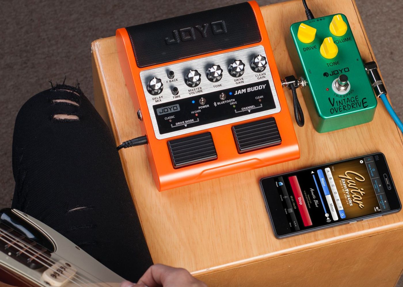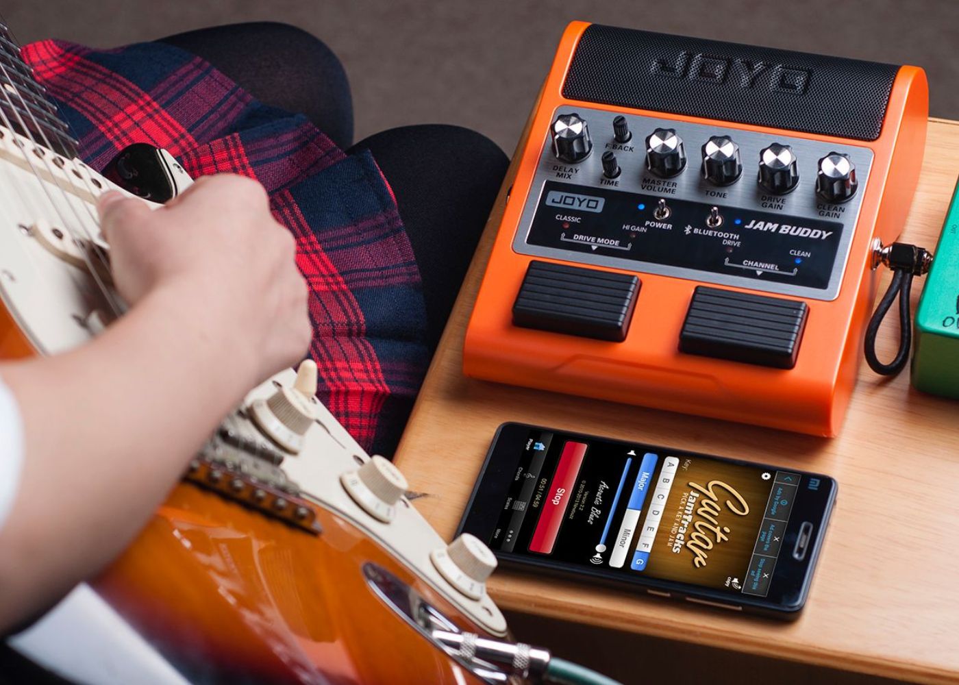 JAMBUDDY has a rechargeable battery, a built-in delay and it accepts additional pedals along side really well. Everything you need to practice and have a great time. doing it!
