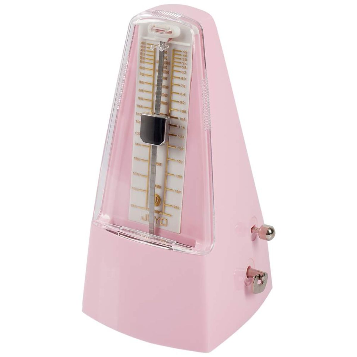 The JOYO JM-69 mechanical metronome features a tempo range of 40-208 beats per minute (bpm), a choice of 0, 2, 3, 4, or 6 beats per measure, and a bell that accents the first beat. It uses a traditional spring-powered winding mechanism, requires no batteries, and is constructed with durable plastic and metal components.