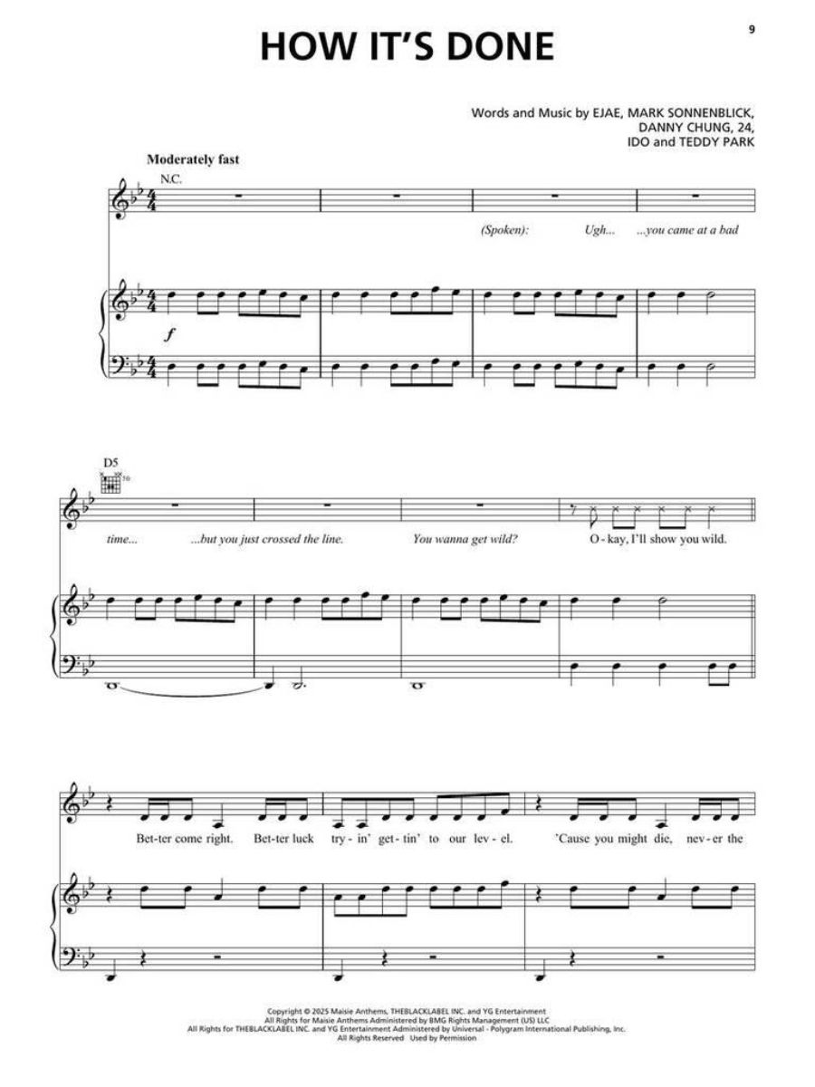KPop Demon Hunters has taken the world by storm, breaking streaming records on Netflix and sending its soundtrack to the top of the charts. Called charming, funny and artfully punchy and praised as a thrilling animated spectacle… full of bops, the film has become a true pop-culture phenomenon. This matching songbook features all 10 songs from the film arranged for piano and voice with guitar chords: Takedown · How It’s Done · Soda Pop · Golden · Strategy · Your Idol · Free · What It Sounds Like · Love, Maybe · Path. Perfect for fans, musicians, and performers, this collection captures the excitement, heart, and unstoppable energy of the year’s most talked-about film!