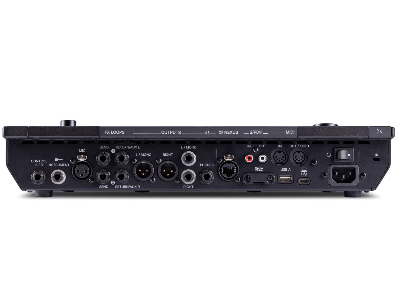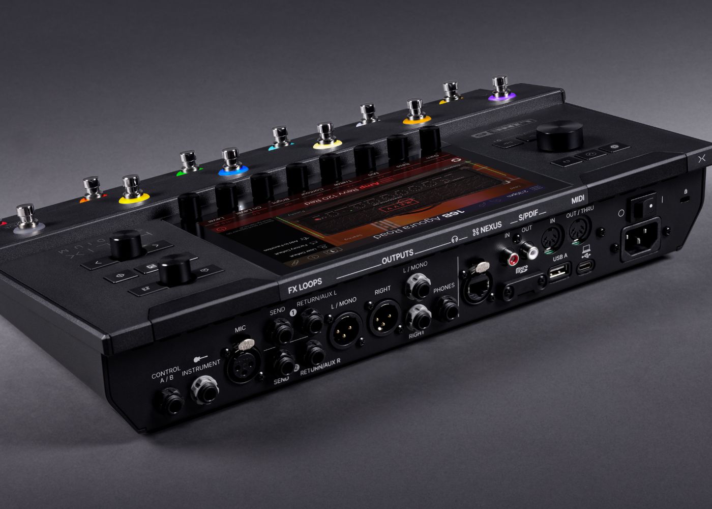 Helix Stadium Floor provides an extensive array of analog and digital inputs and outputs, including Instrument and Microphone inputs, XLR and 1/4″ analog outputs, a Phones output, two send/return jacks, two multipurpose dual Control jacks, and S/PDIF digital I/O. There are also DIN and USB MIDI connectors, a USB A port, and a proprietary Nexus port for use with the optional Expand D10 and future peripherals. Multiple external footswitches and expression pedals, such as the optional EX2, are supported.