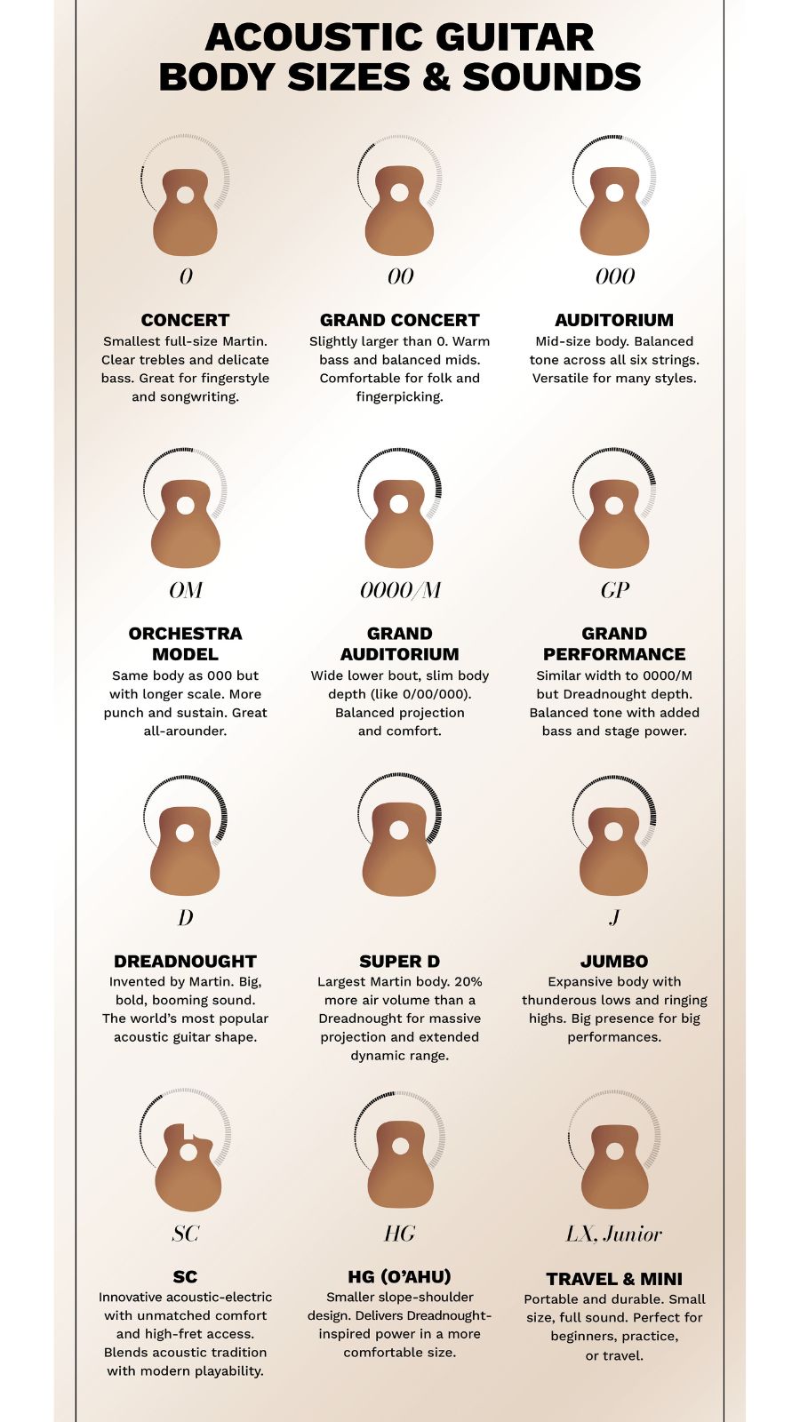 If not used to the language, the different body sizes of guitars can be confusing as to what might suite you best. Here is a useful guide to Martin Acoustic guitar body sizes