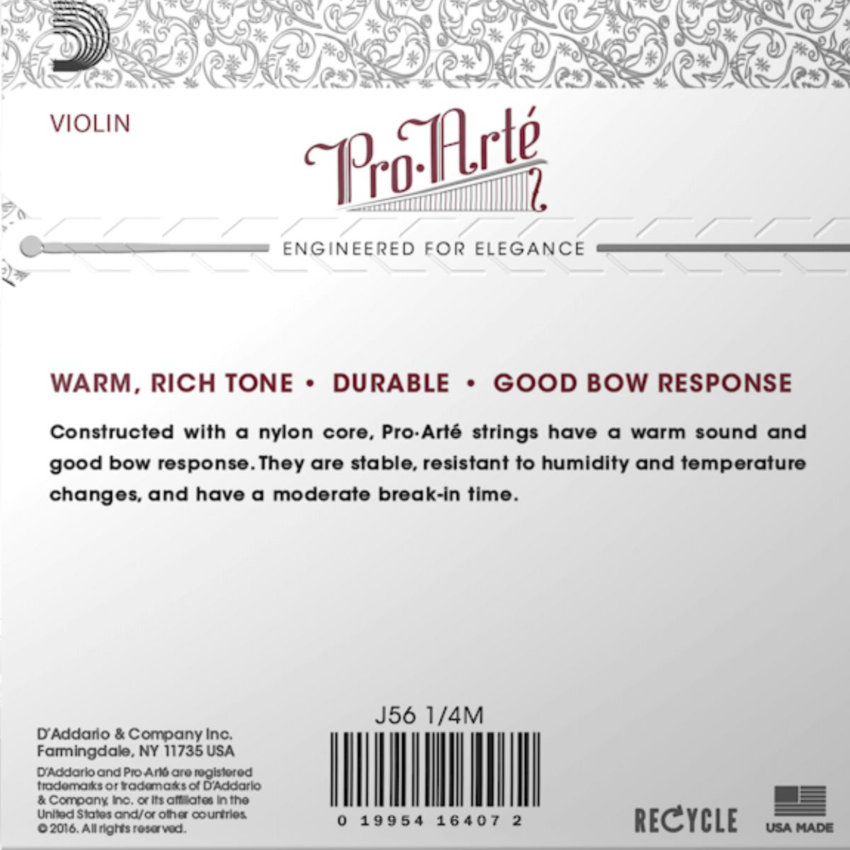 Scaled to fit 1/4 size violin with a playing length of 10 1/2 inches (265mm), Pro-Arté synthetic core violin strings have a warm, mellow tone. They are less sensitive to humidity and temperature changes, and break in quickly. Pro-Arté strings are manufactured at a lower tension in order to maximize bow response, tonal blend, and playability. These strings are the perfect choice for players seeking a warm, dark tone.