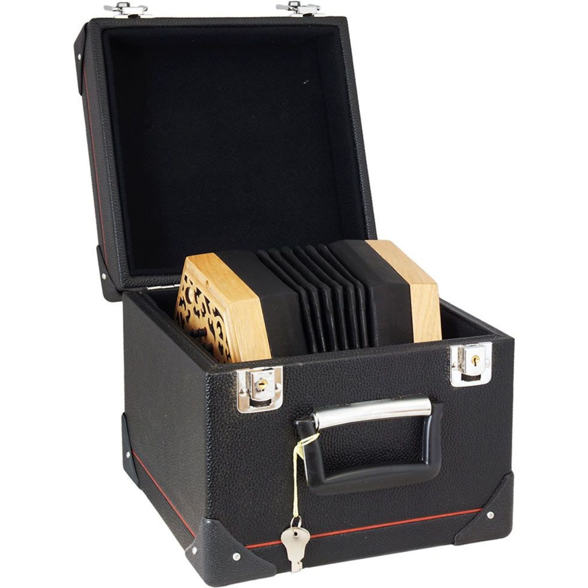 This lovely 3 row C/G Concertina uses the very attractive Solid Catalpa wood ends and beautifully decorated. it comes with Czech accordion reeds mounted on reed pan, a leather cornered and finish bellows with seven folds. It comes complete in a hard protective case.