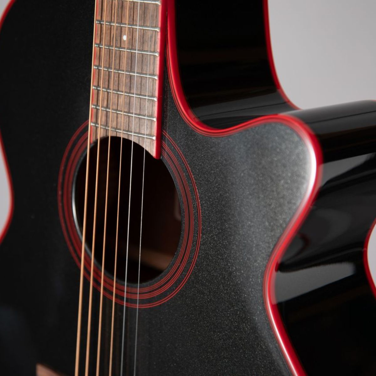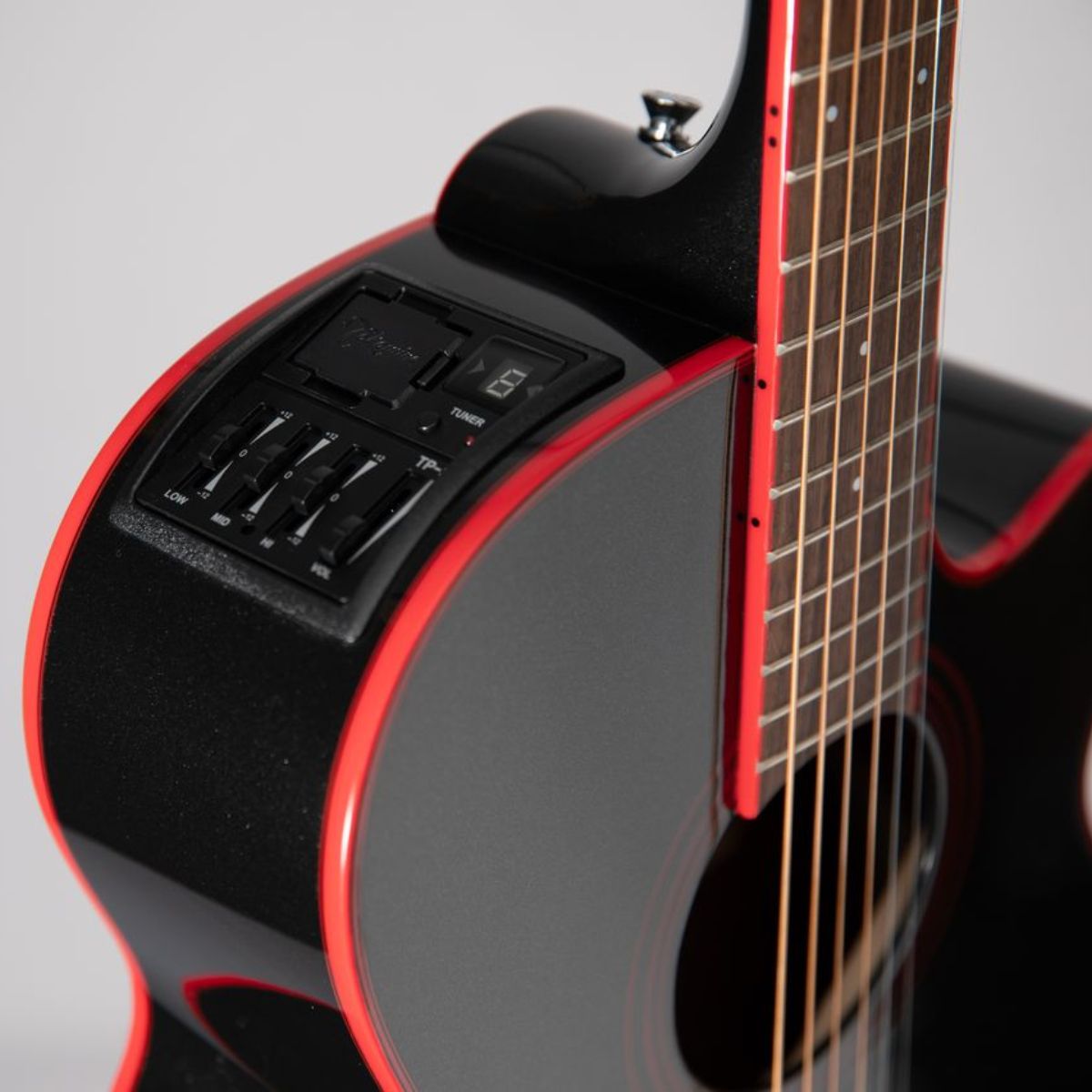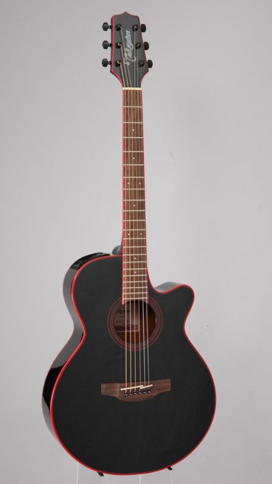Here’s an outstanding flashback to Takamine’s ‘80s-era heritage! The GF49CE CB is totally awesome in its Cosmic Black Sparkle finish and classic red binding! Beneath the distinctive colours lives a great FX-sized cutaway with a spruce top and sapele back and sides. This combination gives the guitar tremendous warmth and volume that belies its compact size. The neck is sleek, and it showcases Takamine’s legendary playability. Of course, it might get loud… a task easily accomplished when you plug it in, using its built-in TP-3G electronics. Turn it up!