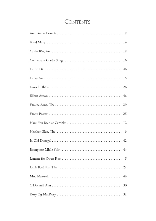 Connemara Cradle Song, Derry Air, Eileen Aroon, The Heather Glen, In Old Donegal and many more classic Irish tunes.