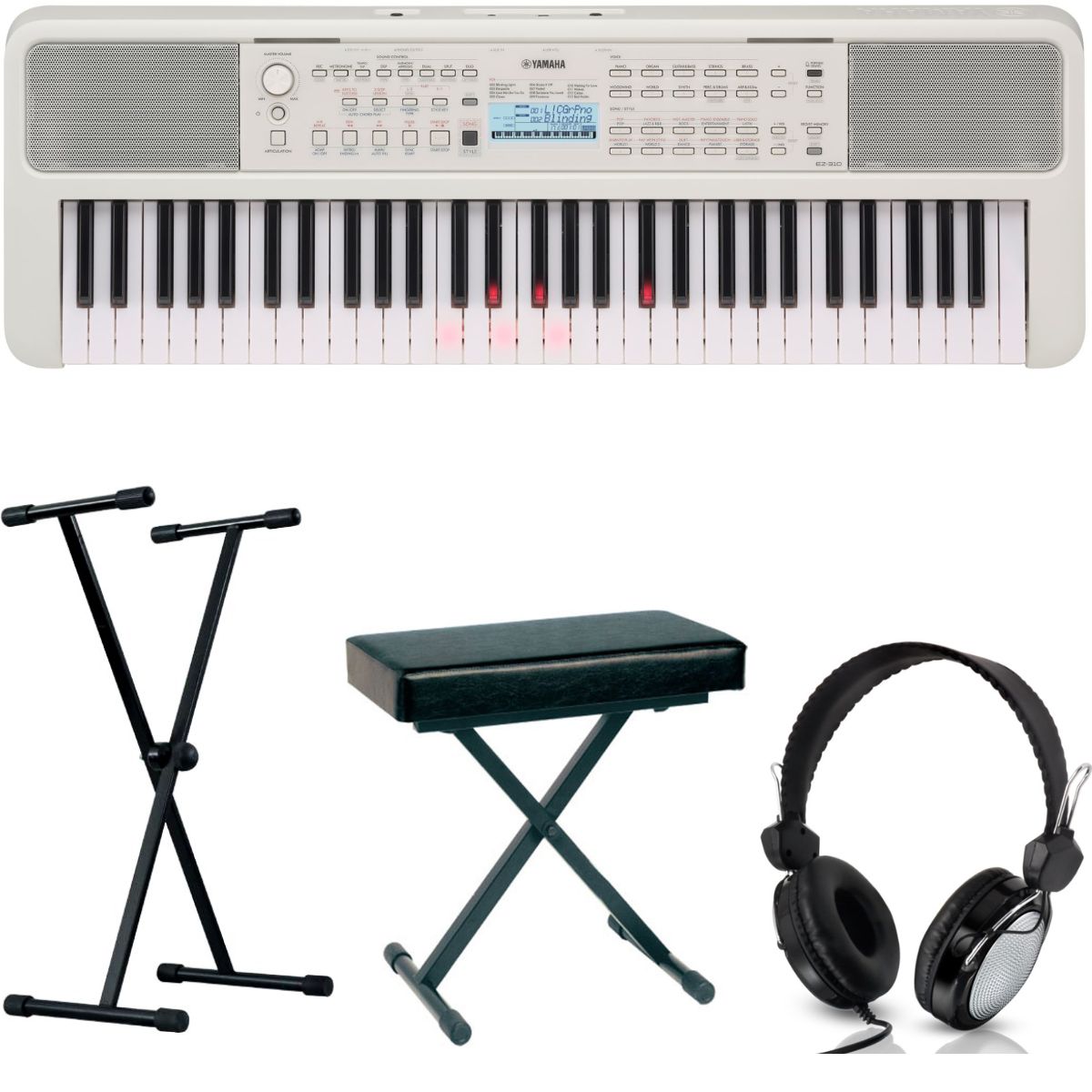 Our great value Yamaha EZ310-4 Portable keyboard Bundle. Includes White Keyboard, Stand, Bench, and Headphones.