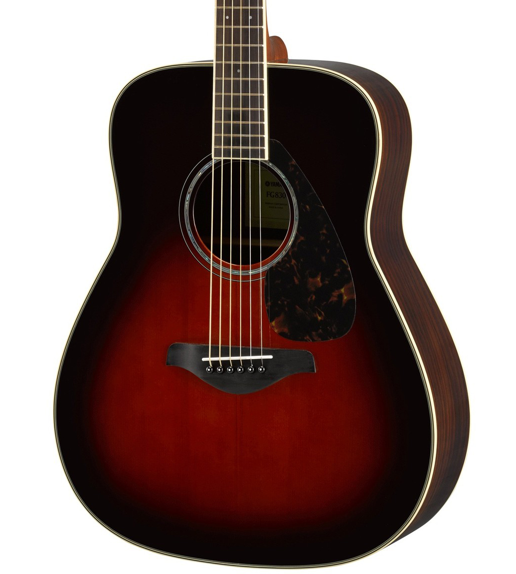 Yamaha's FG Series FG830 is a full-sized traditional dreadnought acoustic guitar with a solid spruce top, rosewood back and sides and a tobacco brown sunburst finish. Suited to both solo performance or playing with a full band, the FG830 utilizes a newly developed scalloped bracing design which results in a powerful and balanced acoustic sound with stronger lows and mids than its predecessors.