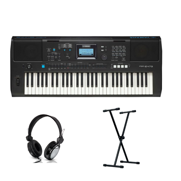 This great value Yamaha PSR E473 Deluxe Bundle includes the Keyboard, a keyboard stand and Headphones, a great start on your musical journey