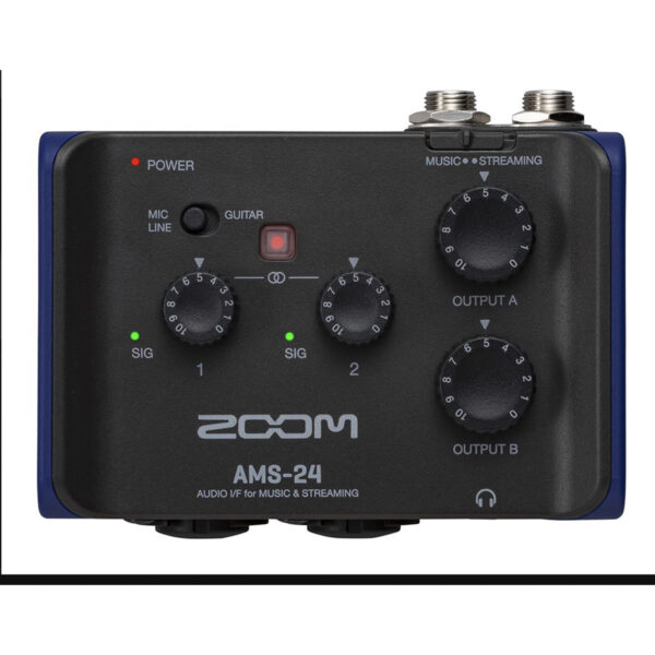 The AMS-24 is perfect for solo streams and multi-instrument sessions. It features two XLR/TRS combo inputs along with Zoom’s low-noise preamps. Also included are two headphone outputs and two TRS outputs for external monitors.