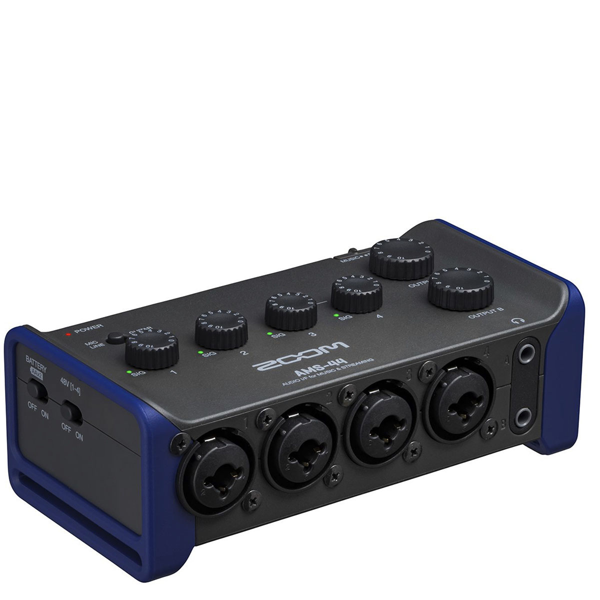 Whether you’re recording or streaming, the AMS-44 keeps your setup simple. It features four XLR/TRS combo inputs along with Zoom’s high-performance, low-noise preamps. The interface also includes two headphone outputs and two TRS outputs for external monitors.