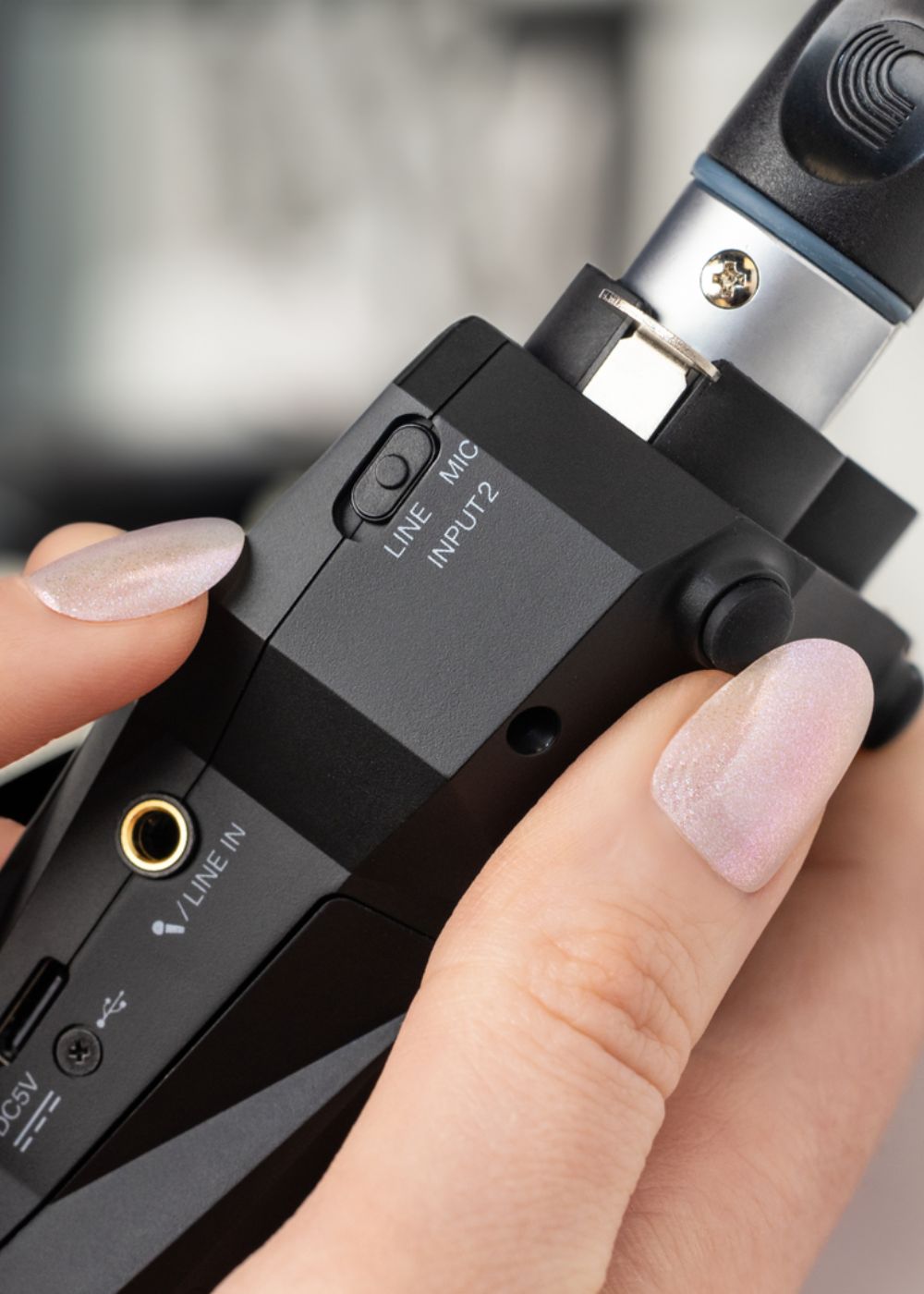 The high-contrast OLED screen makes it easy to navigate through the H1 XLR’s simple interface. The real-time waveform display lets you see your audio as it records.
