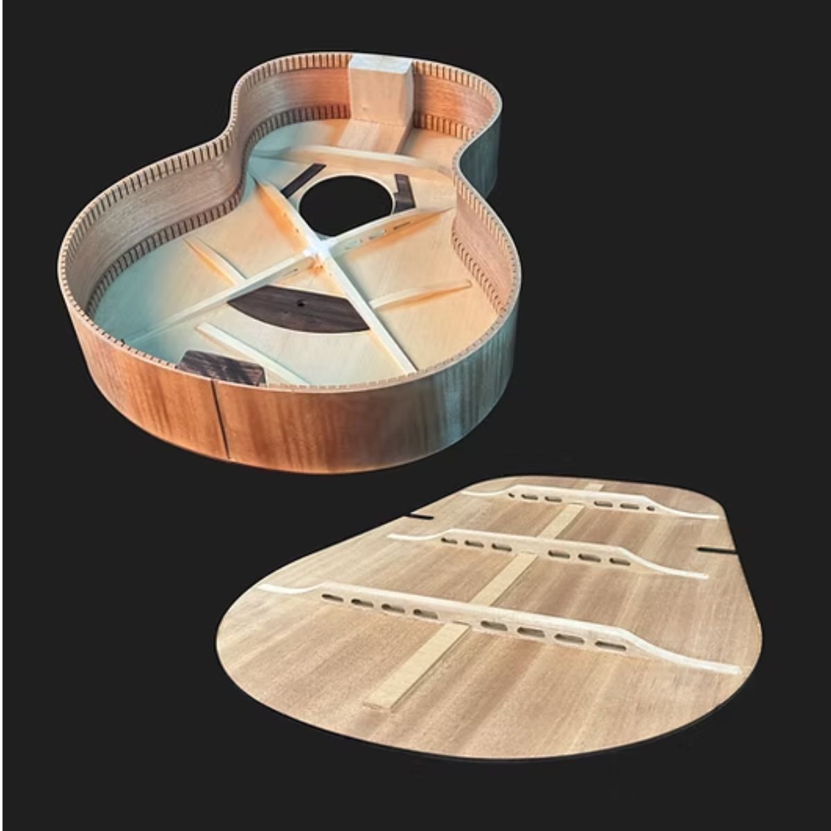 This handcrafted guitar features exquisite 5A Flamed Okoume, sourced from the lush African forests. The unique grain patterns and rich tones of this wood not only enhance the aesthetic charm of the instrument but also contribute significantly to its captivating visual presence. The combination of striking appearance and exceptional tonal quality elevates your playing experience, promising a remarkable musical journey every time you pick it up.