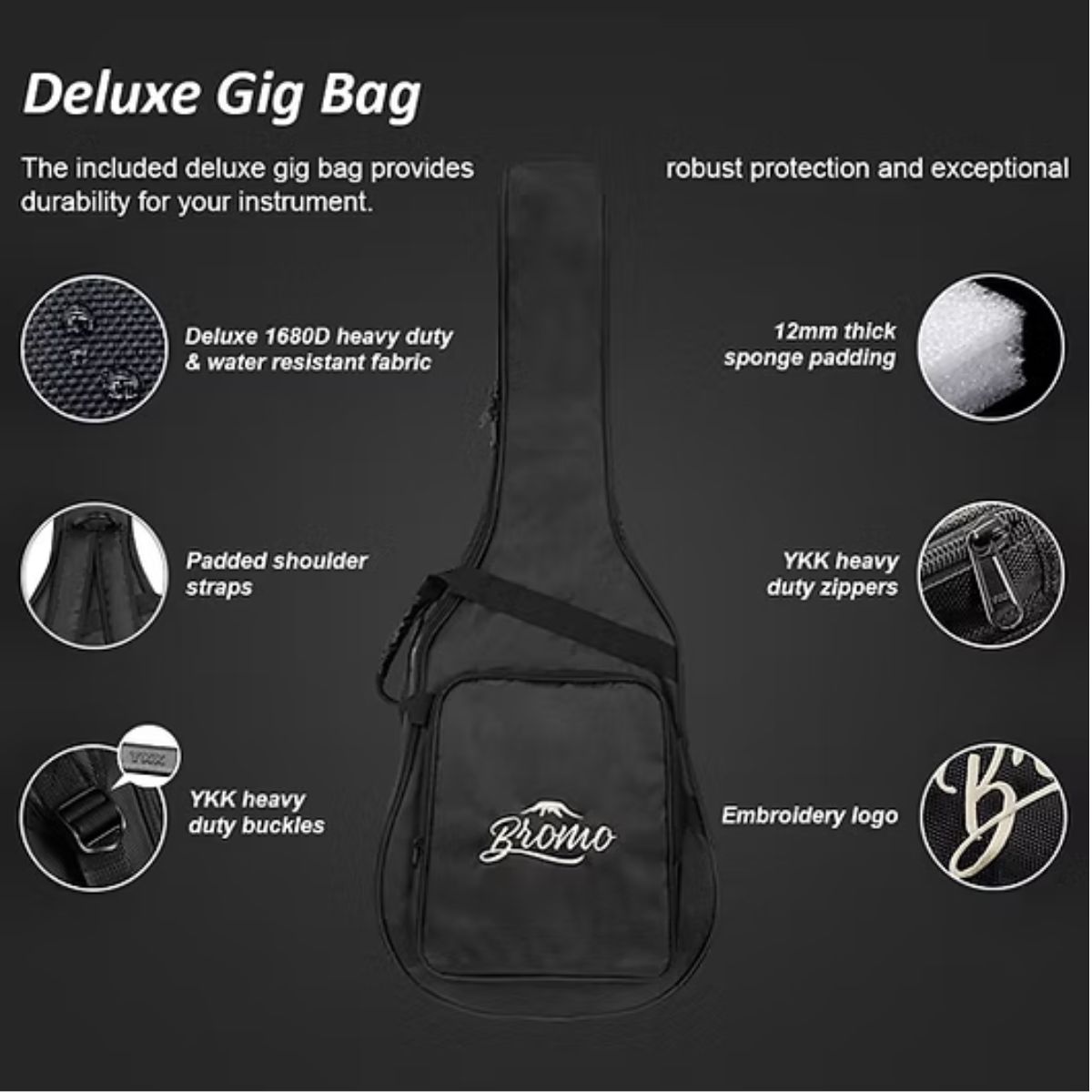 The guitar comes with a high-quality Heavy Duty Carry Bag. This bag offers exceptional durability, water resistance, and ease of transport, ensuring your guitar is well-protected while being easy to carry around in style