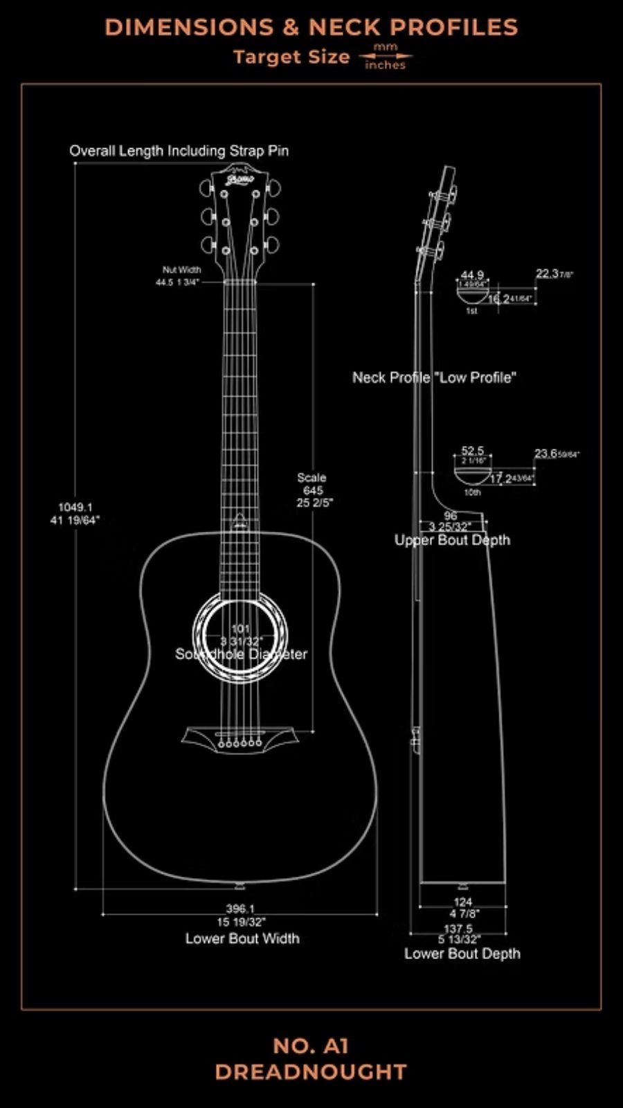 With this Dreadnought guitar from the Bromo Rocky series guitars, once more Bromo brings a wonderful value guitar to the musician with this retro look Vintage Sunburst finish Dreadnought style Acoustic. With its solid spruce top, solid mahogany back and sides, and a host of Abalone and Ebony features, this guitar sounds as good as it looks. The plastic free feature shows what can be done with great attention to detail, and way superior features and fittings. it has 2 ebony reinforcement strips to lend strength while the low profile neck makes it a pleasure to play. It is hard to look a the features and attention to detail on this guitar without thinking there is something wrong with the price!